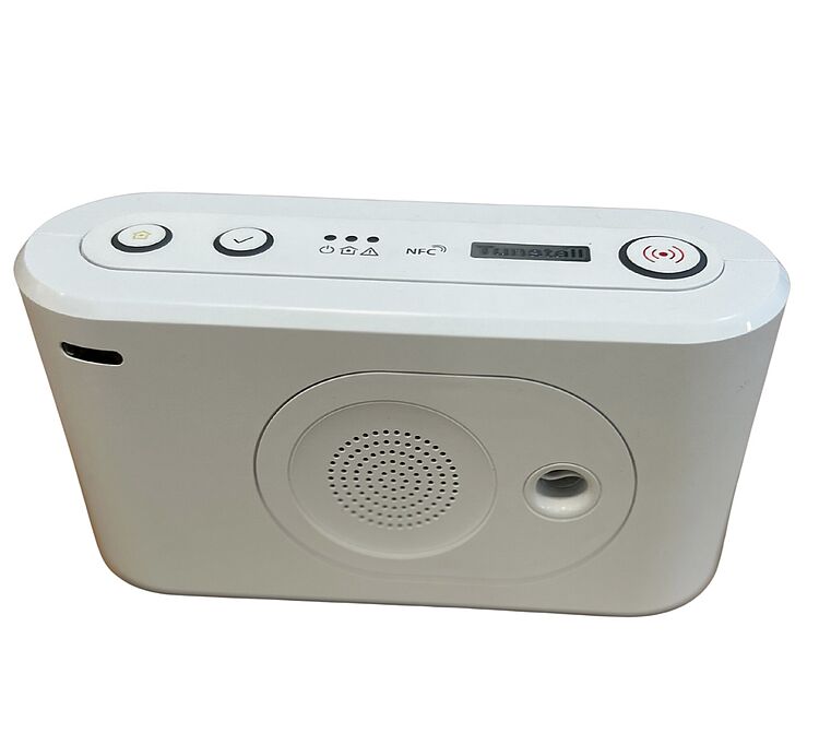 Sie benötigen lediglich die sogenannte Basisstation zusätzlich zu Ihrem Telefon, diese ist nicht viel größer als das Telefon selbst. Die Teilnehmerstation wird durch den mobilen Funksender ergänzt, der so klein ist, dass Sie ihn bequem am Handgelenk oder wie eine Kette um den Hals tragen können. Notrufe können ausgelöst werden durch die Notruftaste, den mobilen Funksender, die Sicherheitsuhr (wenn die gelbe Taste über einen bestimmten Zeitraum hinaus nicht gedrückt wird), aber auch durch Sensoren wie Funk-Rauchmelder, Funk-Bewegungsmelder oder Funk-Kontaktmelder.